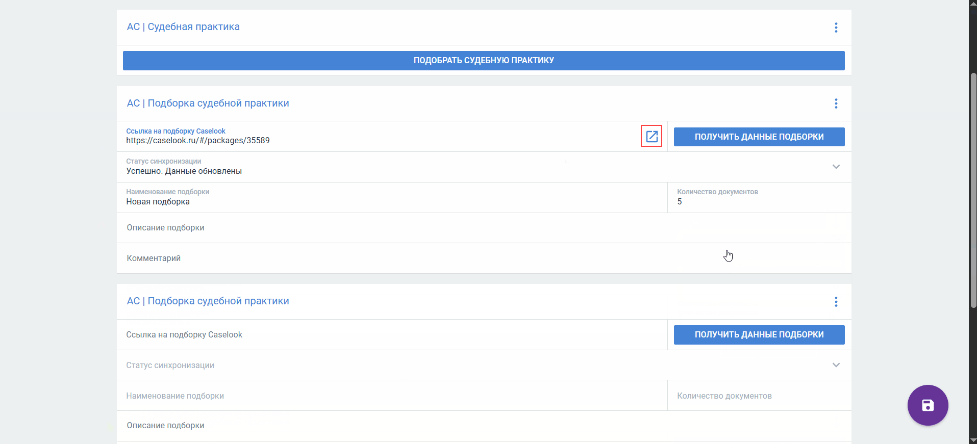 В любой момент вы можете вернуться к подборке в Caselook, нажав кнопку в поле Ссылка на подборку Caselook.