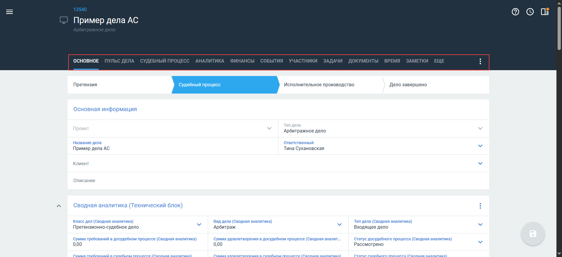 Значения автоматически указываются в блоке Сводная аналитика. Используются для ведения отчетов, контроля данных дела и создания событий-уведомлений. Значение изменяется автоматически при изменении стадии дела: — Претензия — Не инициировано — Судебный процесс — В производстве — Исполнительное производство — Рассмотрено — Дело завершено — Рассмотрено