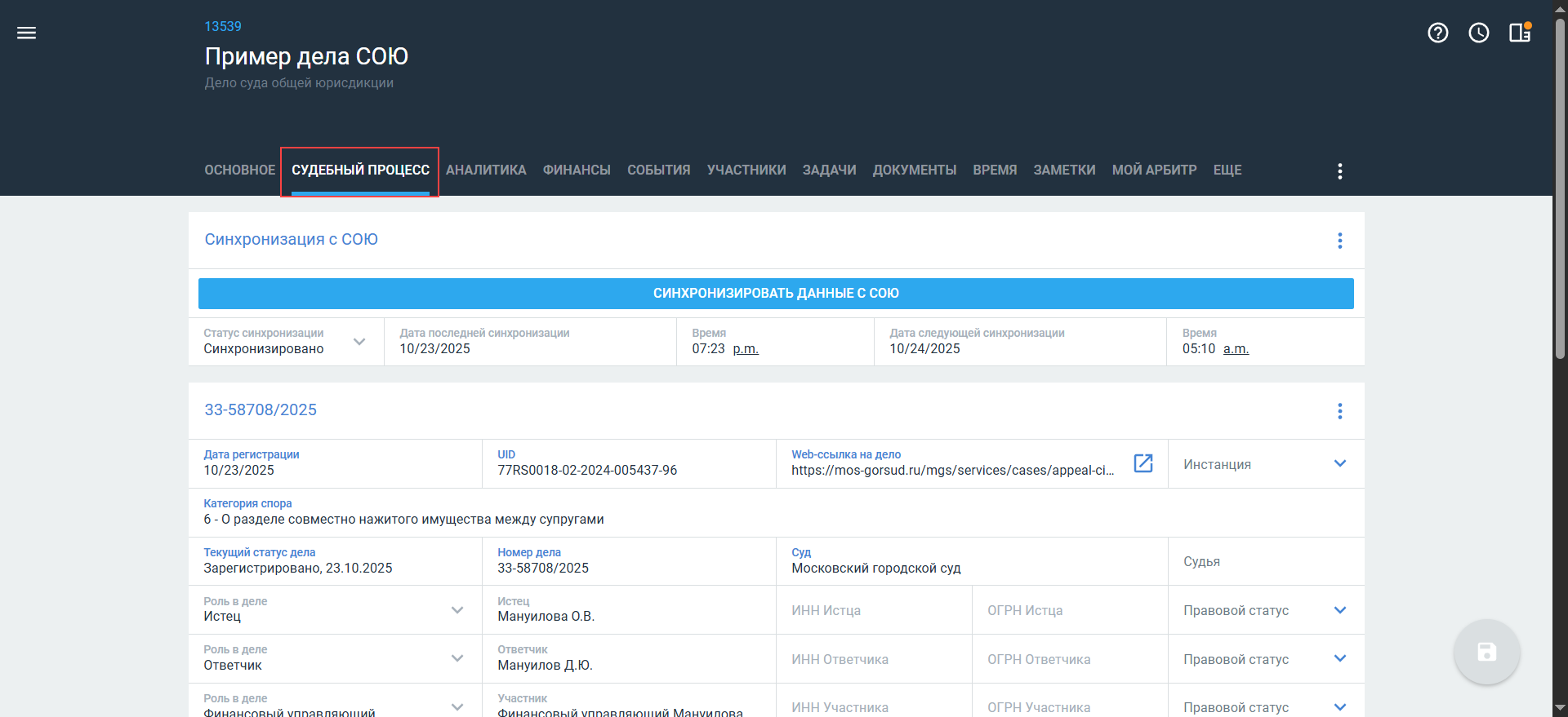 Судебный процесс — на вкладке содержится информация о процессе разбирательства по арбитражному делу или делу СОЮ.