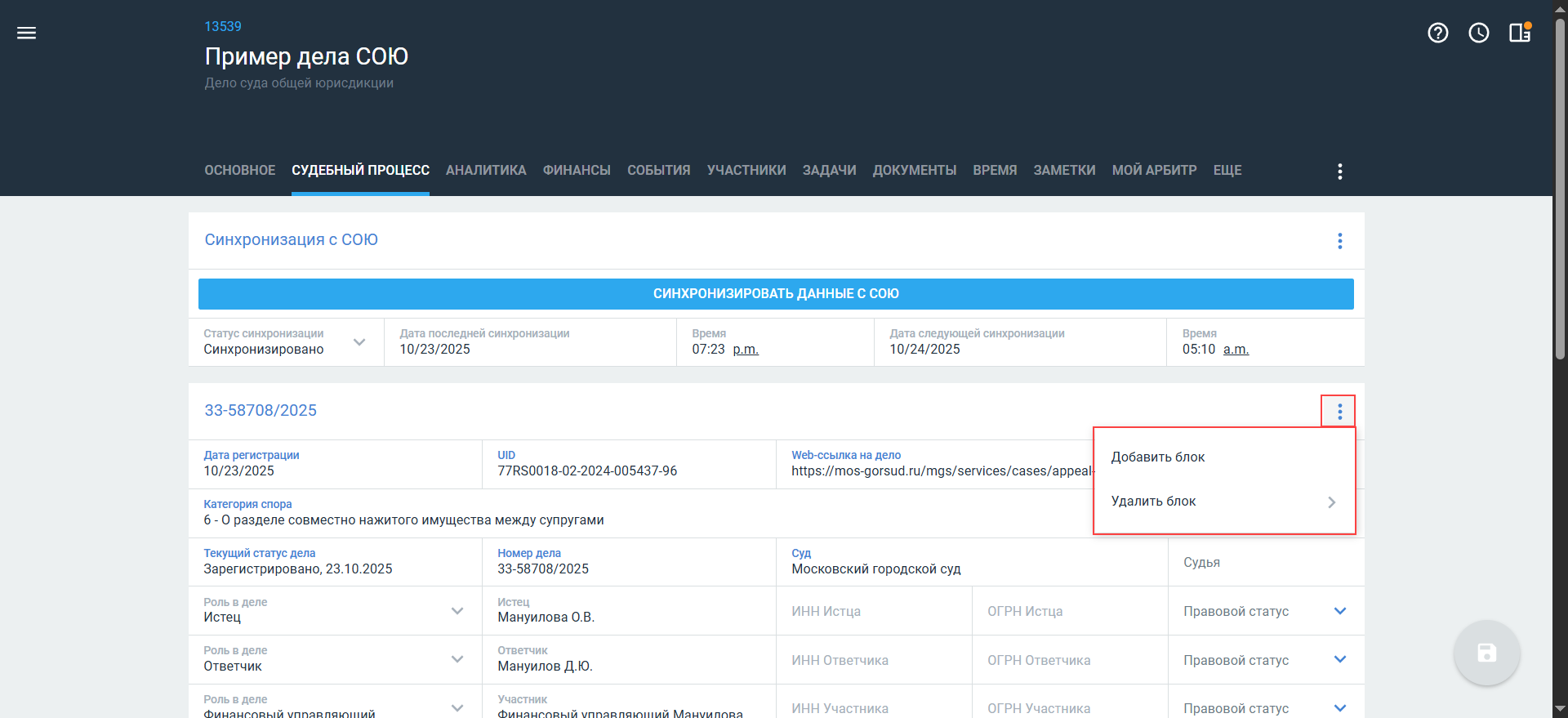 Вы можете добавить несколько блоков с информацией о судебном процессе при необходимости — нажмите кнопку и выберите пункт Добавить блок. Также блоки могут быть добавлены автоматически в результате синхронизации дела с СОЮ.