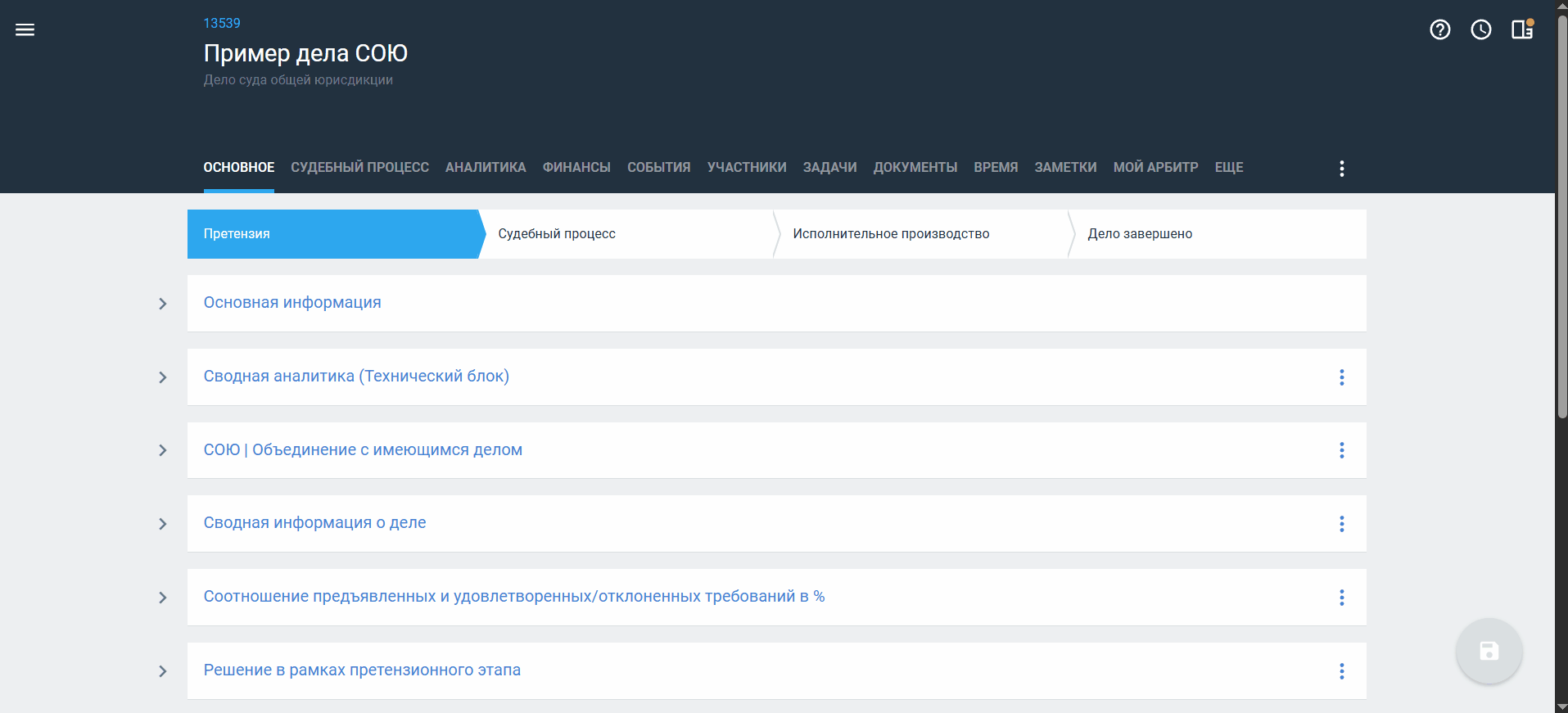 Основные блоки карточки дела СОЮ вне зависимости от стадии содержат следующие поля: