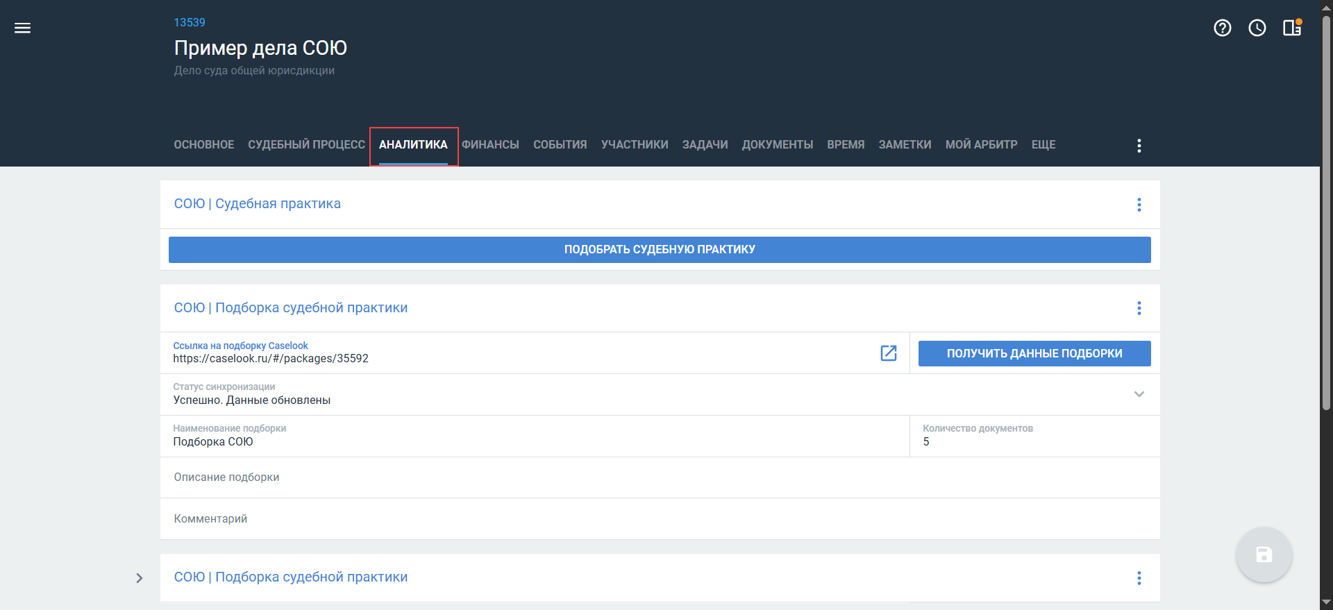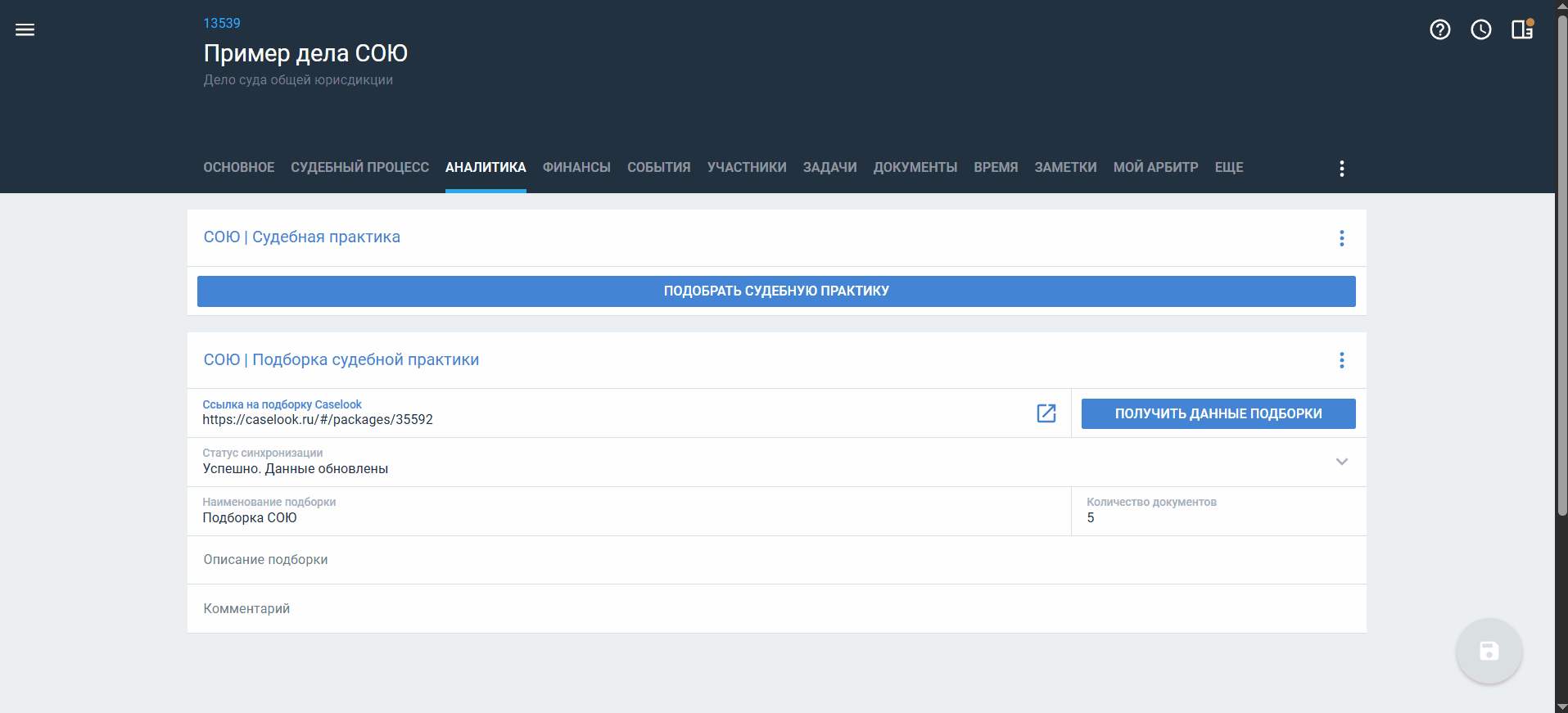 В карточке дела СОЮ на вкладке Аналитика вы можете оперативно получить релевантную практику по текущему делу и сохранить необходимые подборки благодаря интеграции с системой Caselook (ПравоПрактика), чтобы всесторонне охватить судебное дело и качественно вести спор.